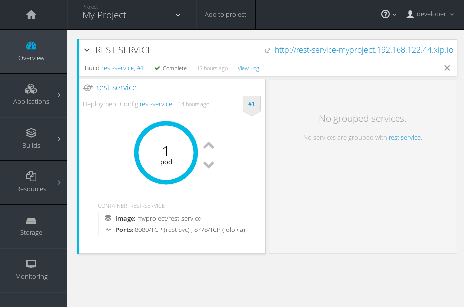 oc create https://raw.githubusercontent.com/alainpham/rest-service/master/openshift/openshift_origin.ymlOpen browser and login as developer to your console https://YOUR_IP_ADDRESS:8443/